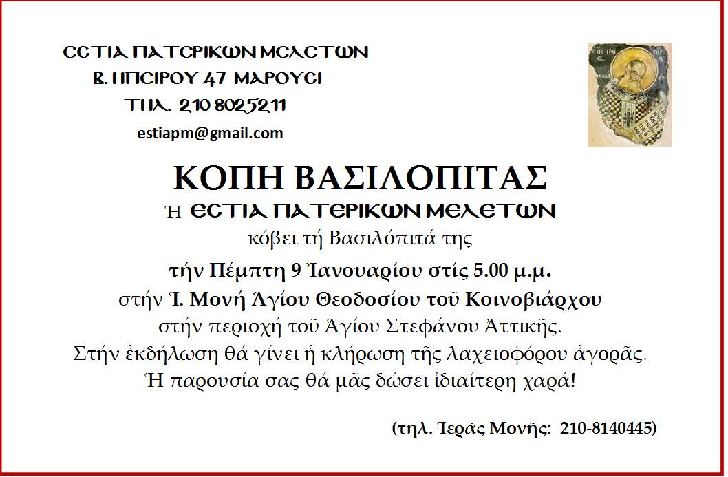 Email Εκτύπωση ΠΡΟΣΚΥΝΗΜΑΤΙΚΗ ΕΚΔΡΟΜΗ ΣΤΑ ΚΑΛΑΒΡΥΤΑ - Σάββατο 16η Νοεμβρίου Ἡ ΕΣΤΙΑ ΠΑΤΕΡΙΚΩΝ ΜΕΛΕΤΩΝὀργανώνει προσκυνηματική ἐκδρομή στά Καλάβρυτατήν 16η Νοεμβρίου, ἡμέρα Σάββατο. Διαβάστε Περισσότερα