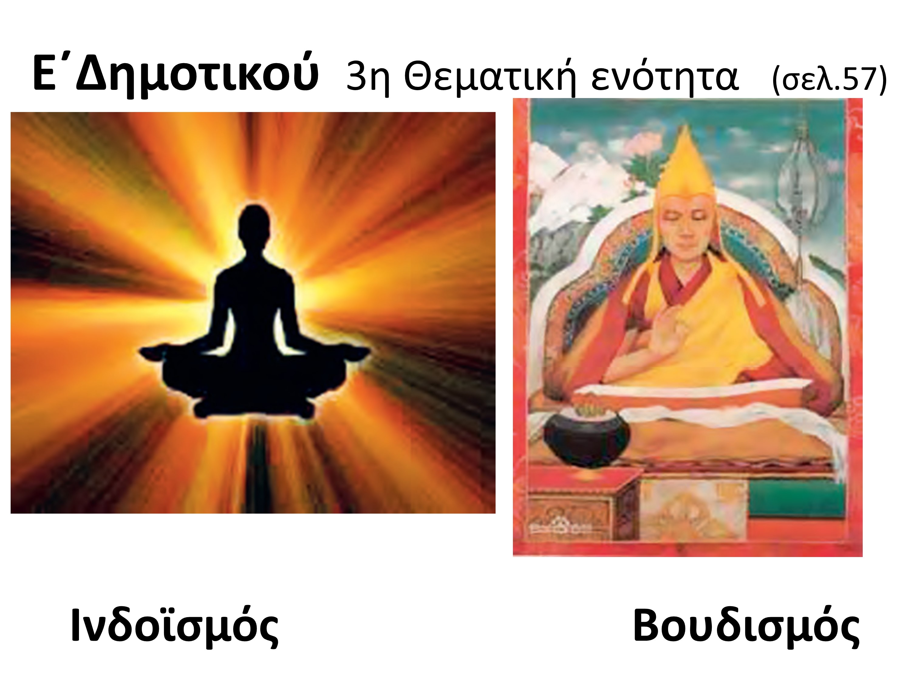 Συγκεκριμένα: Στήν Ε΄δημοτικοῦ στά τρία πρῶτα κεφάλαια ἀναφέρονται οἱ ἀνατολικές θρησκεῖες πολύ ὡραιοποιημένες. Στήν 1η θεματική ἑνότητα μέ τίτλο «Μαθητές καί Δάσκαλοι», μετά τόν Χριστό, ἀναφέρονται καί οἱ δάσκαλοι ἄλλων θρησκειῶν ὅπως ὁ Βούδας, ὁ Λάο Τσέ κ.ἄ. καί δίπλα στή φωτογραφία τους ὑπάρχει ἕνα ὄμορφο ἀπόφθεγμα ἀπό τίς διδαχές τους γιά νά φανεῖ τό «μεγαλεῖο» ὅπως θεωροῦν αὐτῶν τῶν μεγάλων δασκάλων. Βλέπετε στή διαφάνεια δυό ἀπό τούς δασκάλους ὅπως ἀκριβῶς παρουσιάζονται στό βιβλίο. Στή δεύτερη θεματική ἑνότητα ἀναφέρεται ἡ βασική διδασκαλία τῶν τεσσάρων μεγάλων θρησκειῶν καί οἱ νόμοι πού τίς διέπουν πάντα γεμάτοι σοφία. Οἱ διαφάνειες εἶναι ἀπό τό βιβλίο. Στήν 3η θεματική ἑνότητα μέ τίτλο «Νηστεία καί ἄσκηση στίς ἄλλες θρησκεῖες τοῦ κόσμου» ἀναφέρεται καί ἡ λύτρωση πού προσφέρει ἡ ἄσκηση—γιόγκα στόν ἰνδουϊσμό. Στόν Βουδισμό δίνεται ἔμφαση στόν διαλογισμό, τήν περισυλλογή καί τόν αὐτοβυθισμό πού ὅπως λέει τό βιβλίο, βοηθάει τόν πιστό νά φτάσει στήν αὐτοσυνειδησία. Προϋπόθεση γιαυτό εἶναι ἡ ὑπακοή σέ πεπειραμένο δάσκαλο. (3)