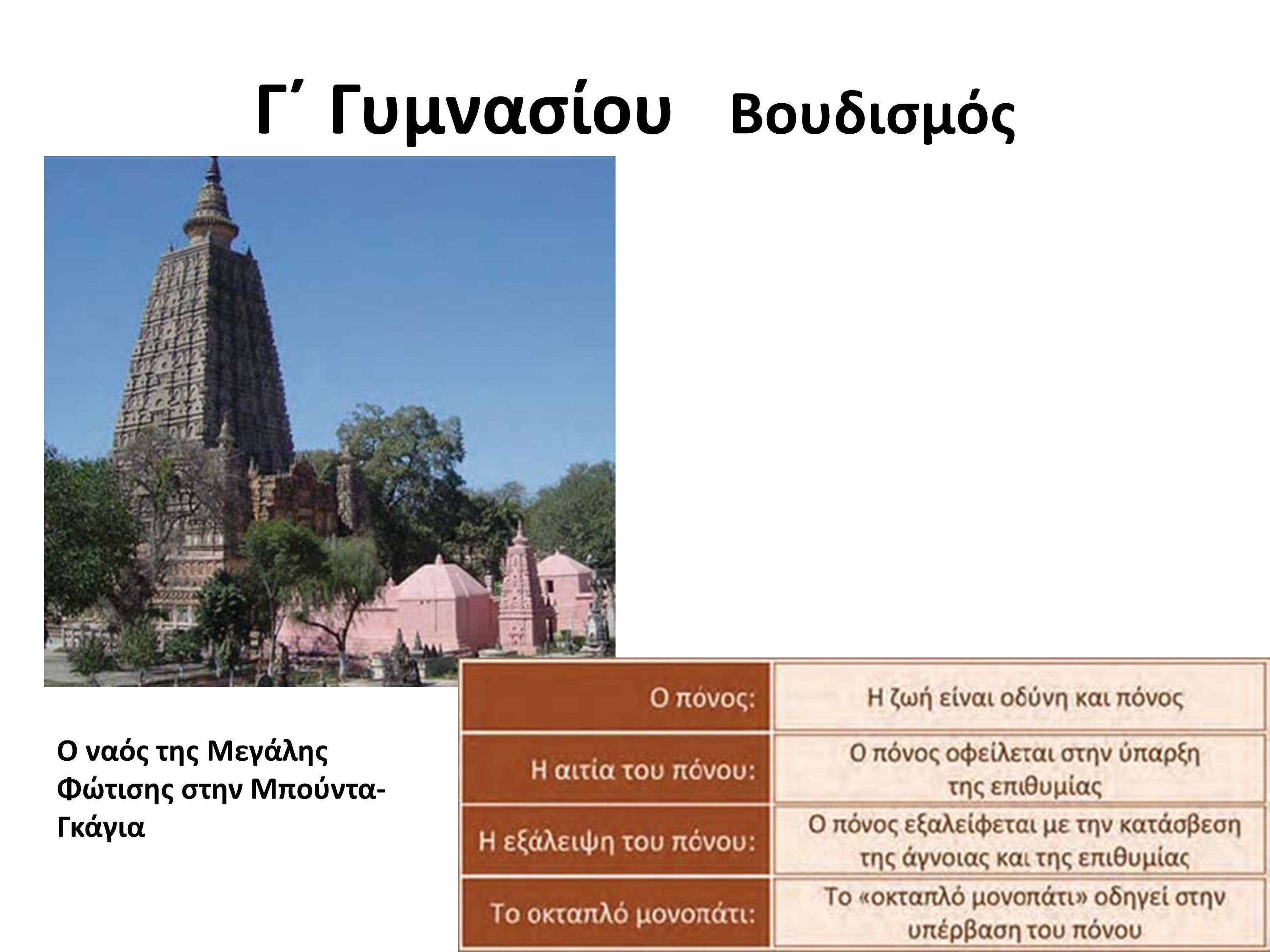Στό βιβλίο τῆς Γ΄ Γυμνασίου στή στάση τῶν θρησκειῶν ἔναντι τοῦ κακοῦ μετά τό Ἰσλάμ γίνεται λόγος γιά τή λύτρωση στόν Ἰνδουϊσμό μέσῳ τῆς ἀνακύκλησης τῶν ψυχῶν (σαμσάρα) γιά τό κάρμα καί τόν σκοπό τῆς γιόγκα, ἐνῶ παρατίθεται πάλι ἡ διδασκαλία τοῦ Βούδα, ὁ ὁποῖος προτείνει τό σβήσιμο κάθε ἐπιθυμίας μέσω τοῦ ὀκταπλοῦ μονοπατιοῦ πού ὁδηγεῖ στή Νιρβάνα.(3)