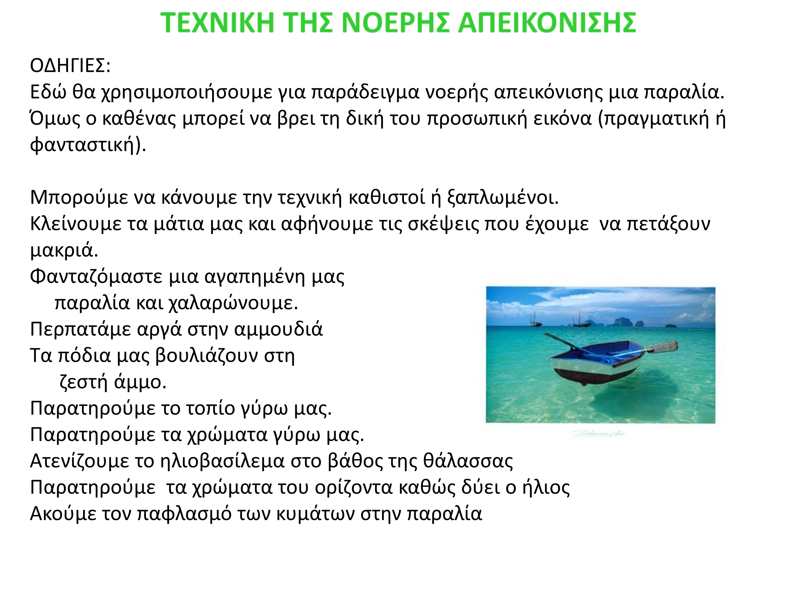 Παρόμοια πρακτική μέ τόν διαλογισμό εἶναι καί ἡ νοερή ἀπεικόνιση στήν ὁποία γίνεται ἰδιαίτερη ἀναφορά στή συγκεκριμένη παρουσίαση (διαφάνειες 25,26,27). Ἀπό ψυχιατρικῆς ἄποψης ἡ νοερή ἀπεικόνιση ἀντί νά βοηθήσει μπορεῖ νά βλάψει κάποιο ἄτομο πού ἀπορροφᾶται ἀπό τόν φαντασιακό του κόσμο καί ὑπάρχει ὁ κίνδυνος κατά τήν διάρκεια τῆς ἀτομικῆς (ὅπως προτείνεται) ἄσκησης νά ἀναδυθεῖ ἐπώδυνο ἤ ἄλλο δύσκολα διαχειρίσιμο συναίσθημα γιά τόν μαθητή, χωρίς νά ὑπάρχει διαθέσιμη ἡ βοήθεια τοῦ εἰδικοῦ ψυχικῆς ὑγείας γιά νά τό διαχειριστεῖ. (5)